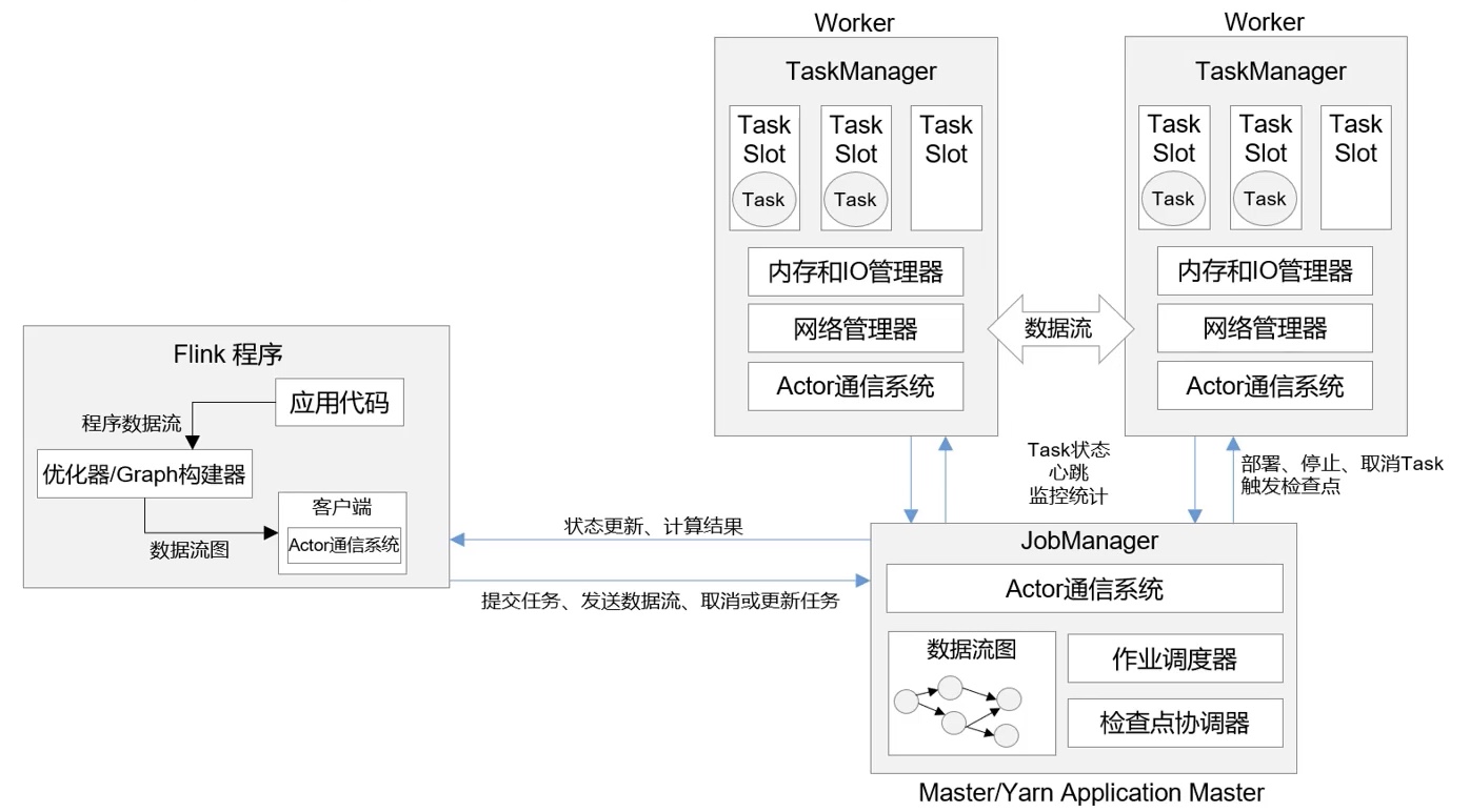 - JobManager 会向资源管 理器(ResourceManager)请求执行任务必要的资源,也就是任务管理器(TaskManager)上 的插槽(slot)。一旦它获取到了足够的资源,就会将执行图分发到真正运行它们的 TaskManager 上。而在运行过程中,JobManager 会负责所有需要中央协调的操作,比如说检 查点(checkpoints)的协调。